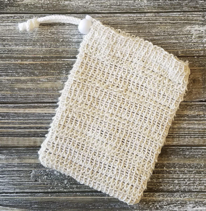 Cotton sisal knitted bag. Pop in your bar of soap – perfect for using as a lathering loofah then to hang you soap so that it can dry and not sit in puddles! (This is an imported product)
