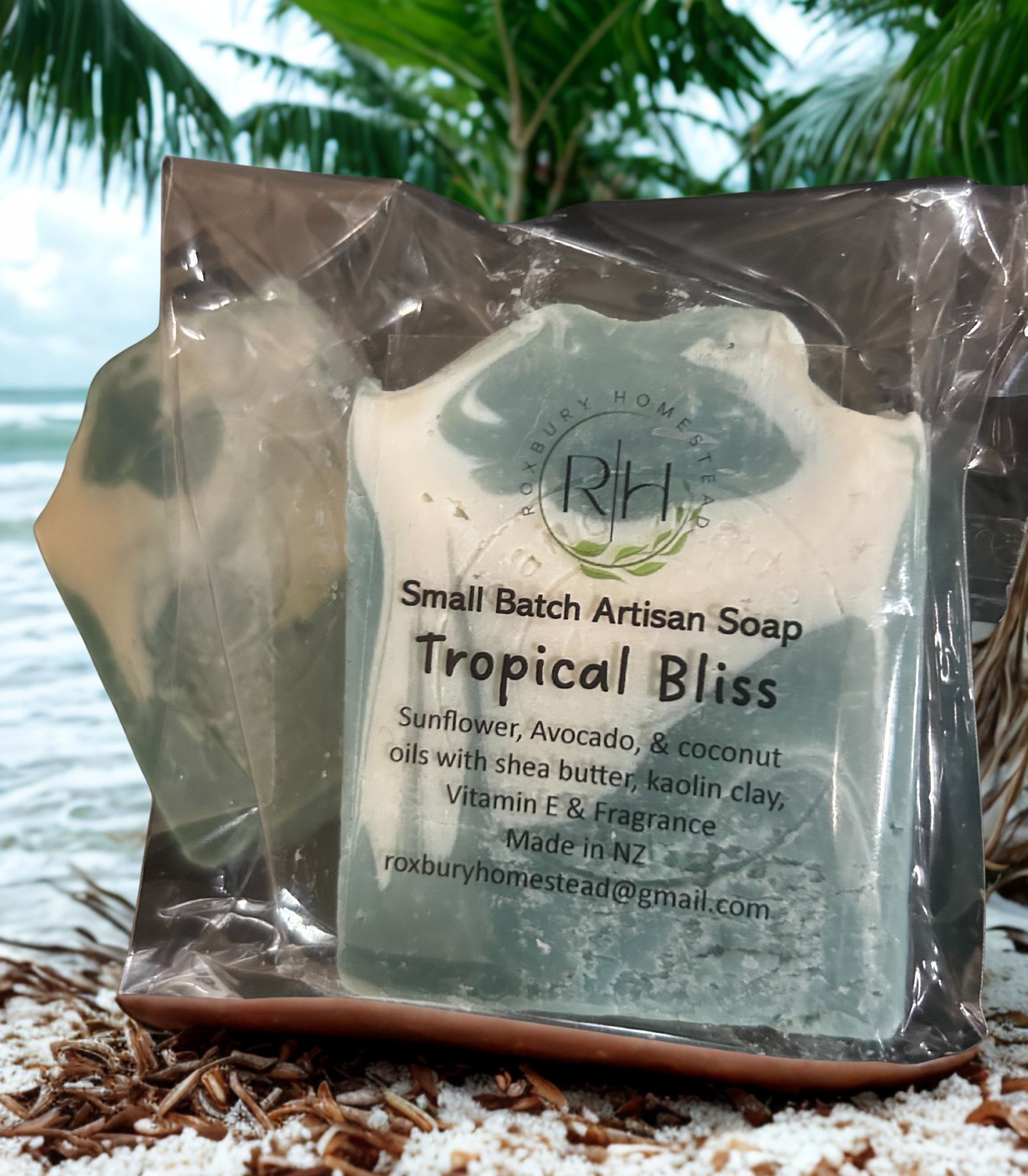 Lather up and escape to paradise. Roxbury Homestead’s signature soap blend—sunflower, avocado, and coconut oils enriched with shea butter. This creates a velvety bar that cleanses, nourishes, and hydrates your skin with every use. Kaolin clay draws out impurities, while Vitamin E protects and softens for a radiant finish.